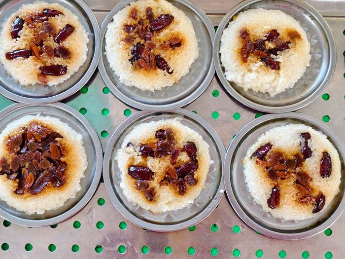 食材摆放完毕后,各班老师有序将孩子们的“作品”送至食堂。食堂师傅们早已备好蒸盘,将一份份满载童趣的八宝饭放入蒸饭柜。随着蒸汽缓缓升腾,糯米的清香与果料的甜香逐渐弥漫整个校园。