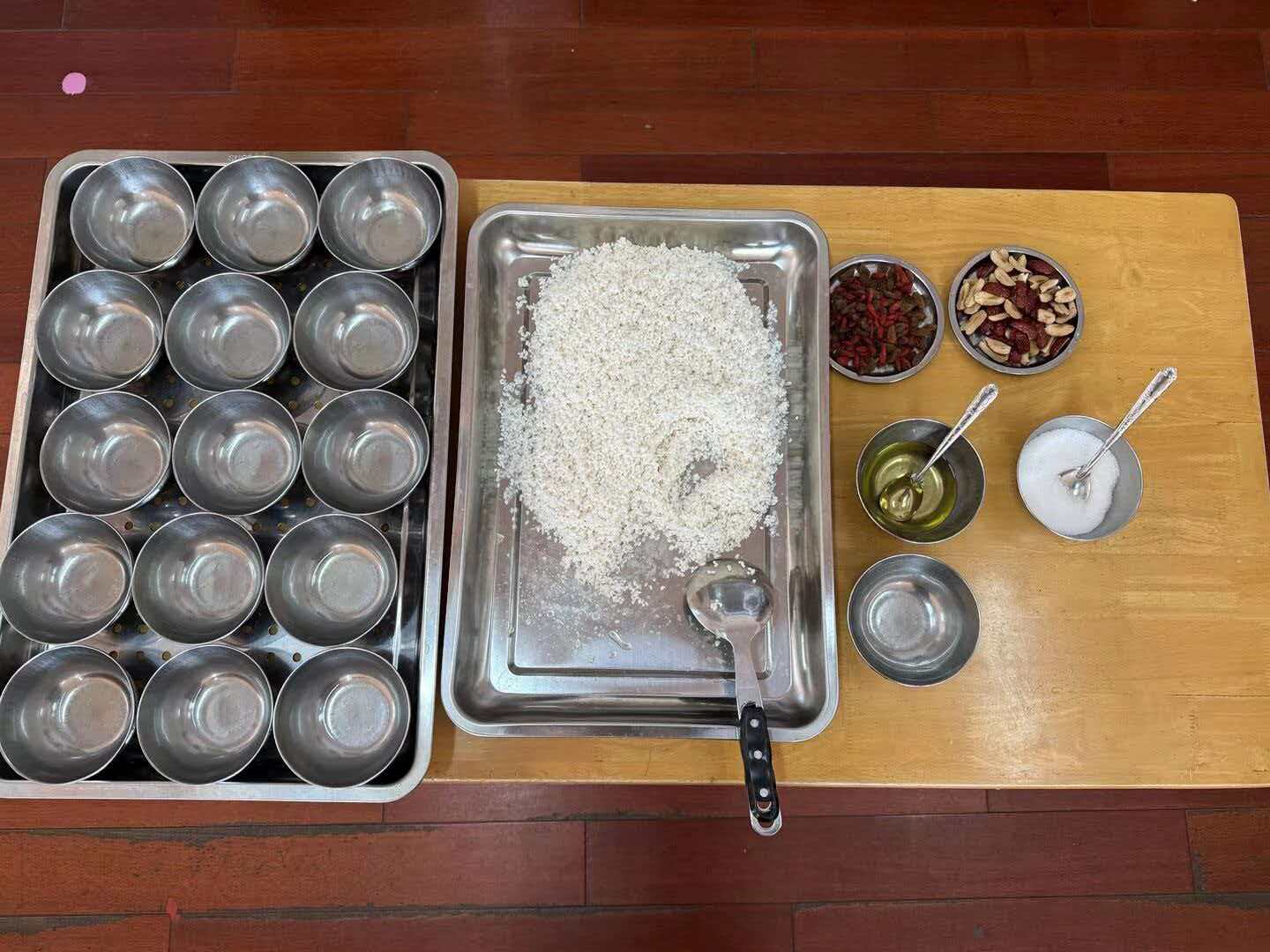 活动前期,幼儿园食堂工作人员严格把控食品安全,精心挑选了颗粒饱满的糯米、香甜软糯的红枣、清脆爽口的葡萄干、枸杞等多种食材,提前完成清洗、泡发等预处理工作,整齐分装至各班,为孩子们的动手体验做好充分准备。食堂的食品安全管理细节贯穿始终,每一份食材都经过严格筛选,确保符合幼儿饮食健康标准,为活动保驾护航。