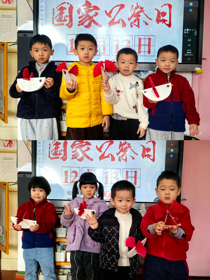 12月13日,是中国人民永远铭记的国家公祭日。为引导幼儿铭记历史、缅怀先烈、珍爱和平,近期,安农大幼儿园各班级结合幼儿年龄特点与认知规律,开展了一系列形式多样、温情脉脉的爱国主义教育活动,让红色种子在孩子们心中悄然扎根。