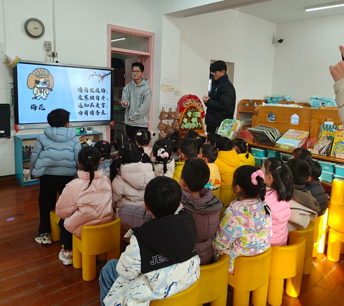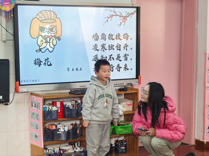 大班的汉语言文学活动则更具探究性,哥哥姐姐带来孩子学习诵读古诗《梅花》,体会中华文学之美和梅花的高尚品节。孩子们在动手动脑中感受传统文化的底蕴,主动探索语言表达的乐趣。