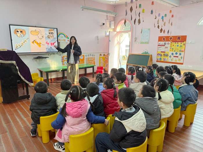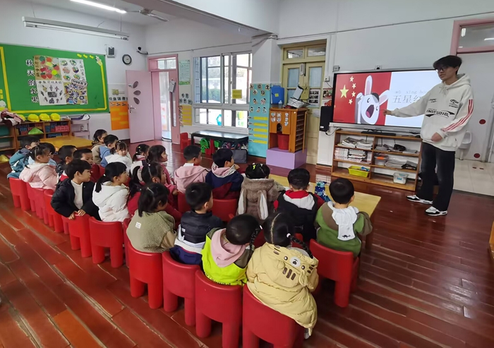 针对不同年龄段幼儿的认知特点,大学生们精心设计了分层活动方案。小班的活动以“普通话启蒙”为核心,通过学会3-5个普通话词汇以及部分简单短句并敢于表达,从而感受到普通话的魅力。孩子们跟着志愿者们跟读,稚嫩的童声充满整个教室,在轻松氛围中夯实了普通话基础。