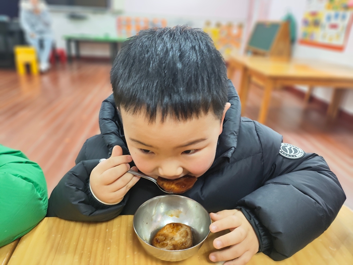 午点时分,一碗碗热气腾腾的红糖糯米藕端上餐桌,瞬间俘获了孩子们的味蕾。“甜甜的,暖暖的,像把小太阳吃进肚子里!”小朋友们一边小口品尝,一边兴奋地分享感受。老师们借着美食契机,向孩子们讲述大寒节气的习俗与“食糯御寒”的传统,介绍莲藕、糯米的营养特点,让孩子们在品尝美味的同时,了解节气文化与饮食智慧。