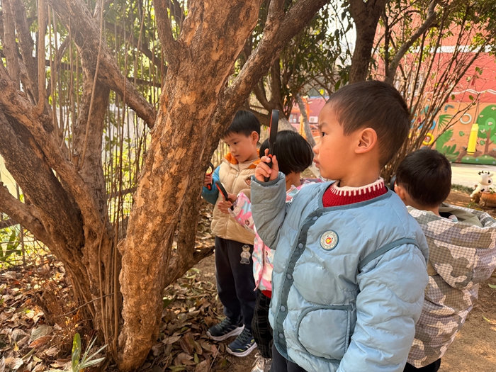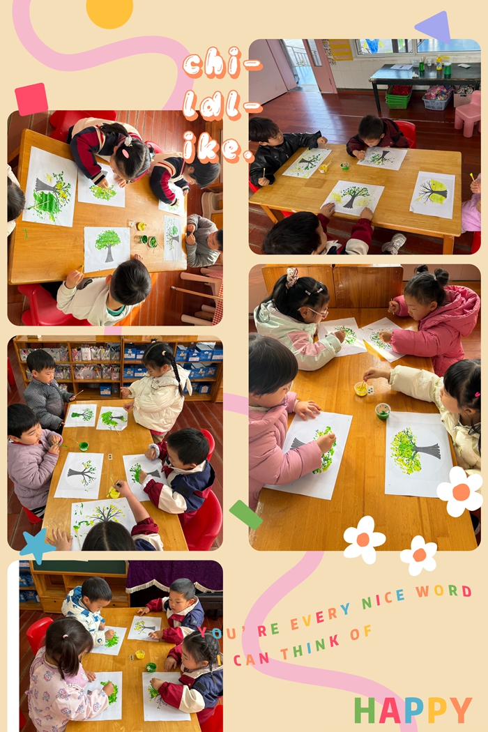 小班宝贝们则用童趣的方式拥抱绿色,小一班拿起画笔描绘生机盎然的小树,用色彩表达对生命的热爱;小二班通过趣味PPT了解植树节由来,再用棉签点画制作“春天小树”,在创作中收获成就感;小三班的孩子们带着放大镜与大树亲密互动,观察树皮纹路、寻找新发嫩芽,在亲近自然中成为护绿小卫士。