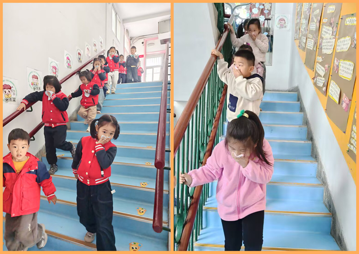 随着急促的火警警报响起,演练正式拉开帷幕。各班教师迅速反应,沉着引导幼儿用湿毛巾捂住口鼻,弯腰低姿,沿着预定疏散路线,快速、有序撤离至操场安全区域。整个过程紧张有序、无推挤、无遗漏,全体师幼顺利完成疏散。