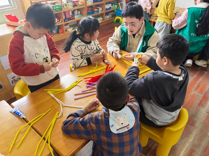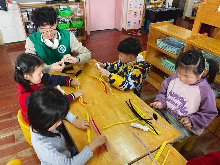 科普环节结束后,手工创作正式开启。志愿者们将彩色扭扭棒分发给每位小朋友,耐心讲解制作步骤,手把手指导大家扭出玉米的形状。孩子们兴致勃勃地动手创作,认真地弯折、拼接,一个个形态可爱的扭扭棒玉米在小手中诞生,现场满是欢声笑语。