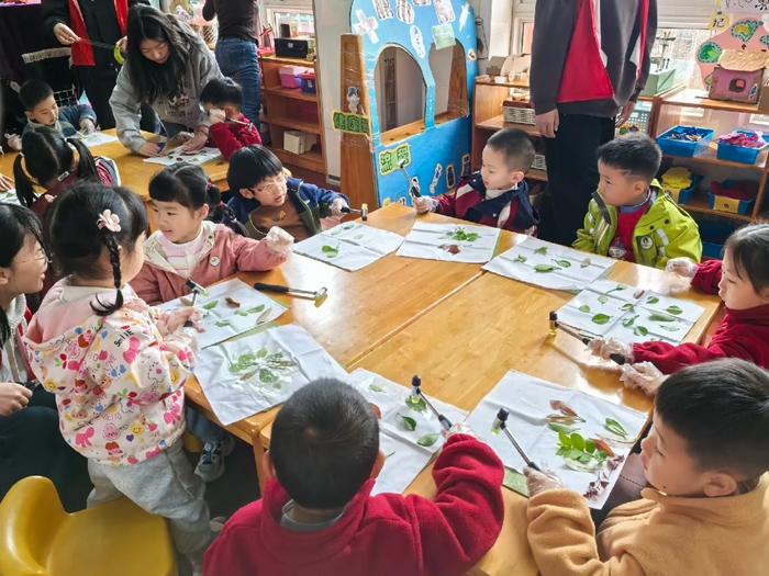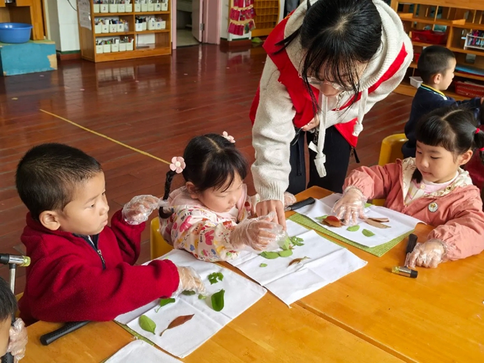 为传承中华优秀传统文化,让幼儿近距离感受非遗魅力,41日上午安农大信智学院非遗进校园志愿服务队走进幼儿园中一班,开展了一场生动有趣的植物拓染活动,为孩子们带来了一场别开生面的传统文化体验课。