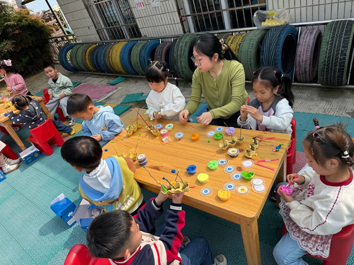 开幕式结束后,各班分组开展特色农耕与创意实践活动。大班幼儿分工协作完成翻土、播种、浇水等劳作,同步创作种植守护牌与春日心愿卡;中班幼儿分设翻土播种、浇水养护、工具管理、观察记录等小组,有序开展玉米种植与记录;小班幼儿以松土、播种、浇水等基础劳动为主,搭配粘土手工、工具创意涂鸦等趣味活动。大三班还创新推出丝瓜络育苗等特色项目,将农耕科普与生活实践深度融合。活动现场,幼儿们手持小农具认真劳作,小手沾满泥土却笑容灿烂,处处洋溢着生机与童趣。