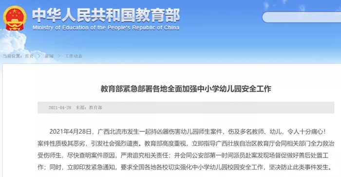 428日,广西北流市发生一起持凶器伤害幼儿园师生案件,伤及多名教师、幼儿,令人十分痛心!案件性质极其恶劣,引发社会强烈谴责。教育部印发紧急通知,要求全国各地各校切实强化中小学幼儿园校园安全工作,坚决防止此类事件发生。