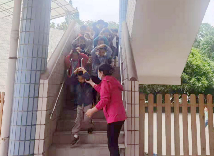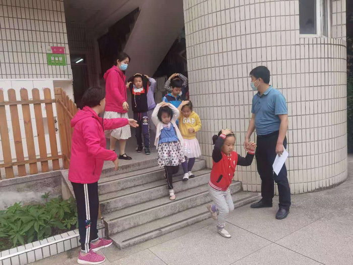 疏散警报声响起,各班老师组织幼儿按预定的疏散路线迅速有序地撤离到安全地带,各班级立即清点人数向指挥汇报。全园百多名幼儿仅用时155秒就全部撤离到户外场地。