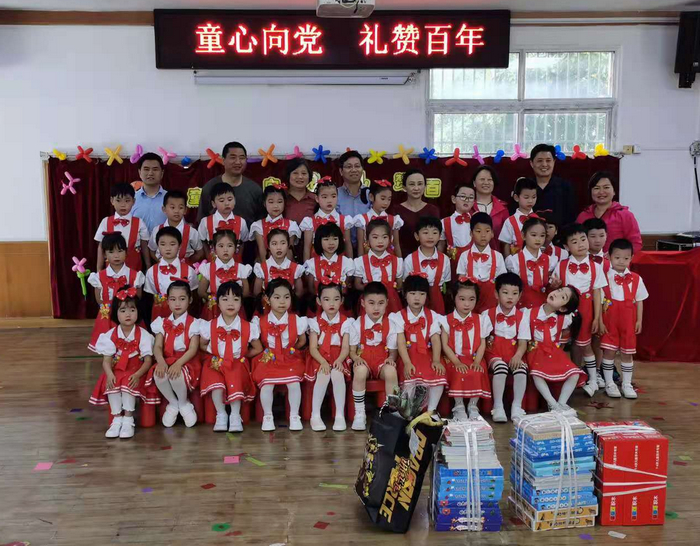 幼儿园大二班的孩子们正在音乐厅录制“童心向党 礼赞百年”云六一合唱汇演的视频,校领导一行得到了孩子们的热烈欢迎,他们给孩子们带去了他们喜爱的玩具和图书,饶有兴趣的聆听了孩子们的演唱,并与孩子们亲切合影。