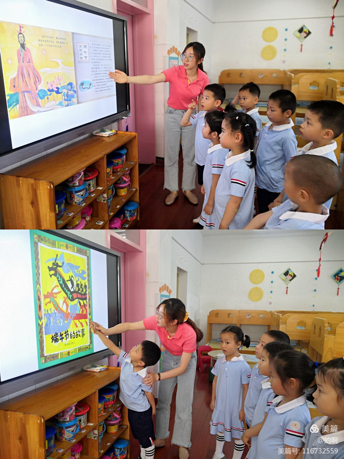 老师通过讲故事、欣赏图片、观看节日相关的视频,引导幼儿追溯端午习俗由来,讲述屈原的故事。了解端午的习俗,吃粽子、赛龙舟、挂艾草、拴五色丝线辟邪......