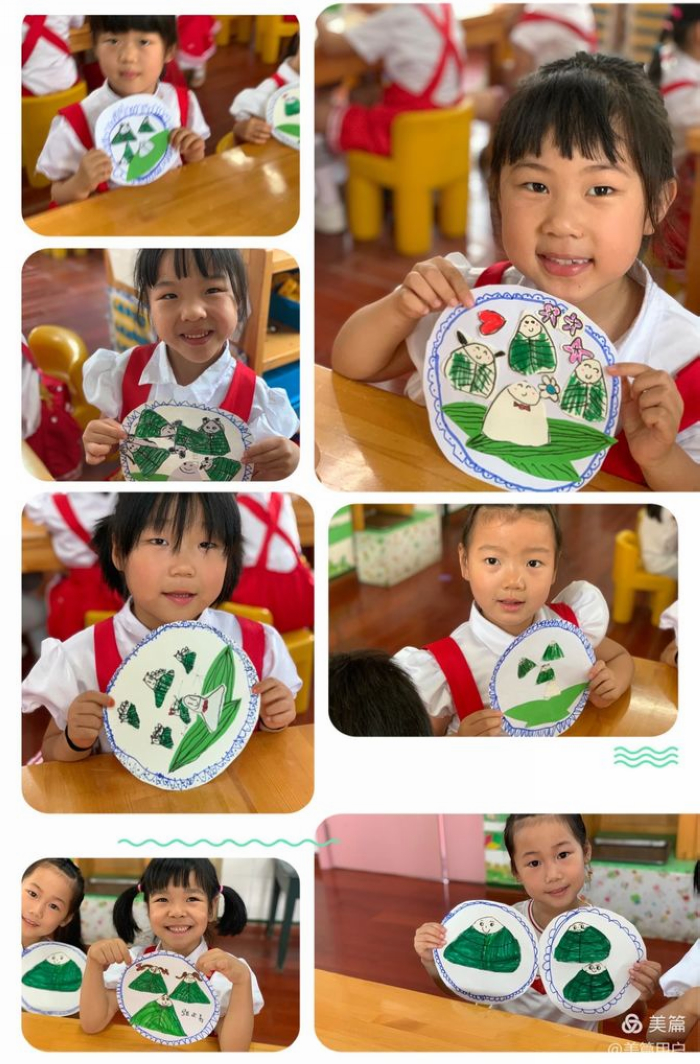 做手工:用绘画、手工等多种形式表现端午节的快乐,发挥幼儿的想象能力,给粽叶花上条纹,给粽子设计表情和口味、花纹,小朋友通过绘画手工的方式来设计一幅粽子画。
