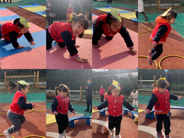 再来看看小班的宝贝们,别看他们入园时间不到一个学期,可学会了不少本领,“小蚂蚁们”手膝着地快速爬行,双臂平展走过弯曲的平衡木,双脚并拢跳过圆圈看,篮子里的“豆豆”快速送回了“家”,动作行云流水一气呵成,小小的身体里蕴藏着大大的能量,让人赞叹不已。