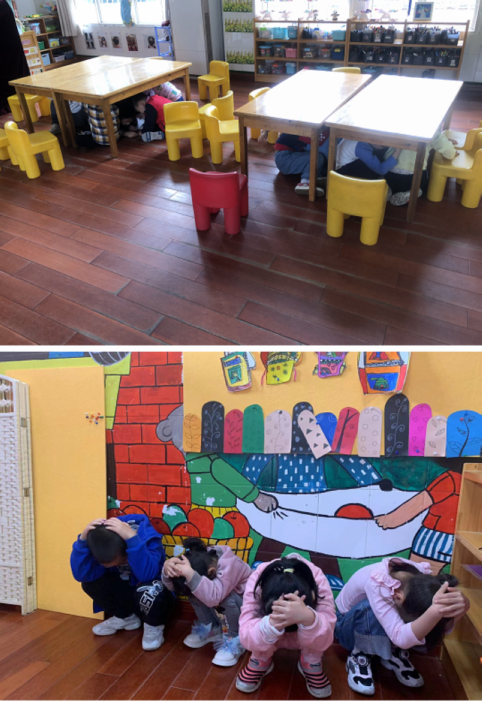 上午930分,随着第一次警报响起“地震来了,快就近躲避!”孩子们立刻抱住头,躲在桌子下、墙角等易形成三角空间的地方,进行紧急避险