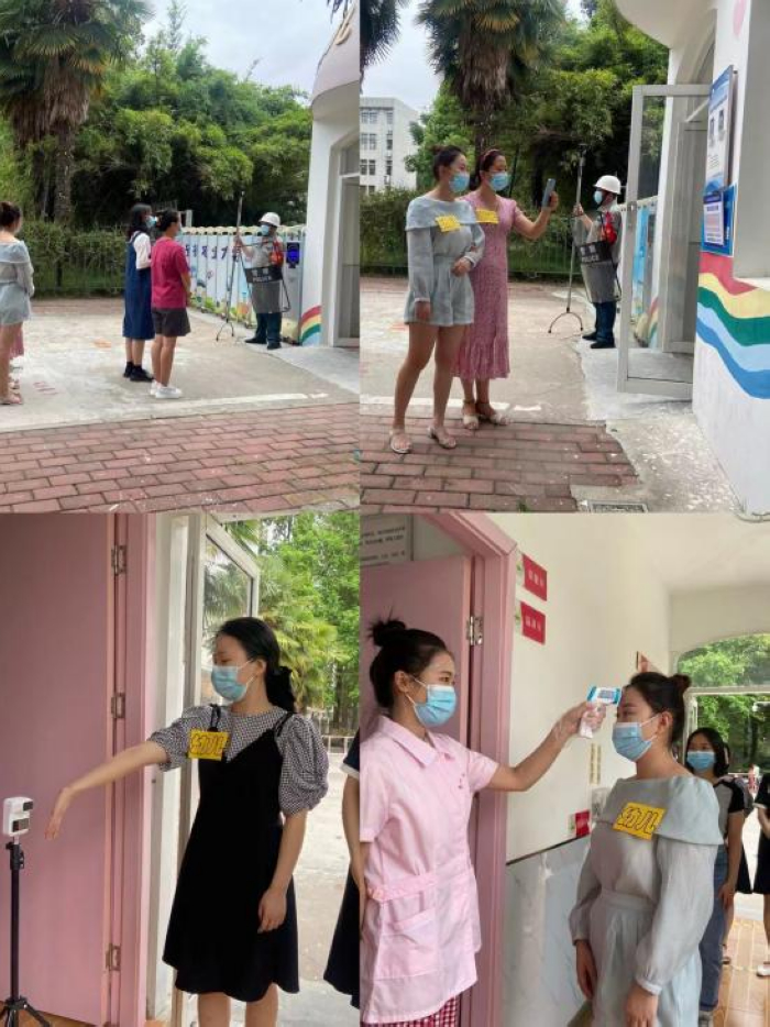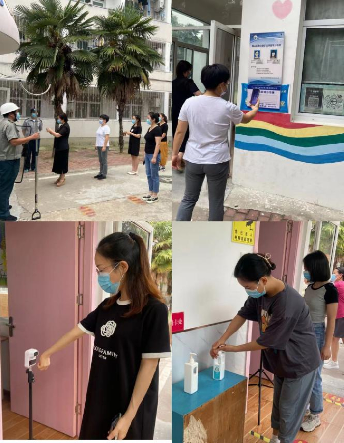 1)入园前,教职工扫二维码,保安确定绿码后在园所门口处的体温测量点,对全体教职工测量体温并做好记录;