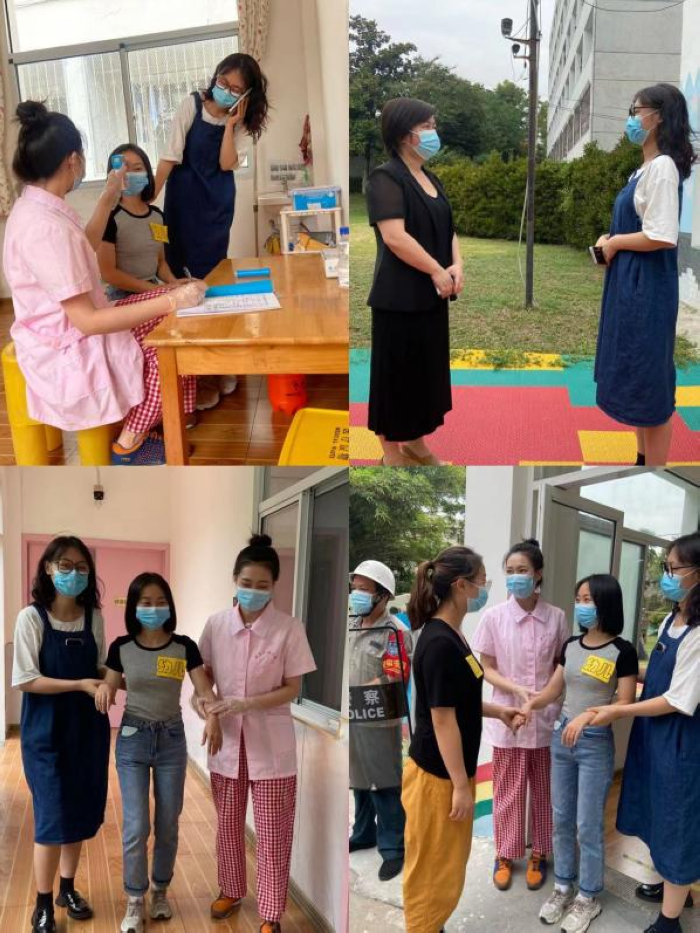 2)检测体温正常后,每名幼儿进行晨检,晨检老师一摸、二看、三问、四查的流程仔细检查幼儿的身体状况,配班教师站在指定位置引导幼儿自主走到相应的教室门口。主班教师再次在班级门口检测幼儿体温并登记,探测体温正常后保育老师带领幼儿放置物品,然后在流动水下,按七步洗手法洗手。进入班级参加晨间活动。