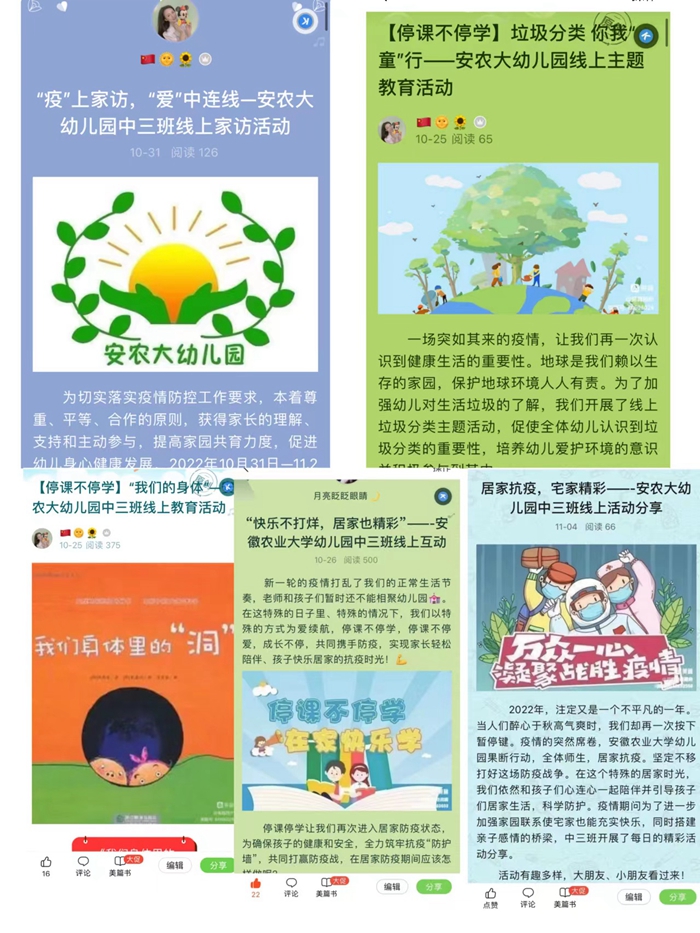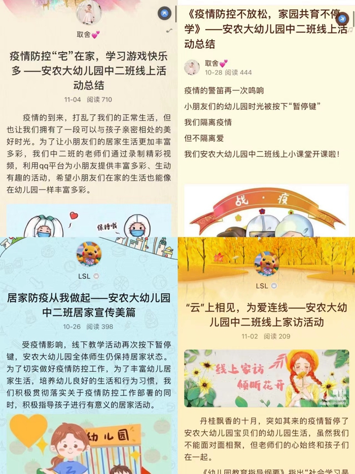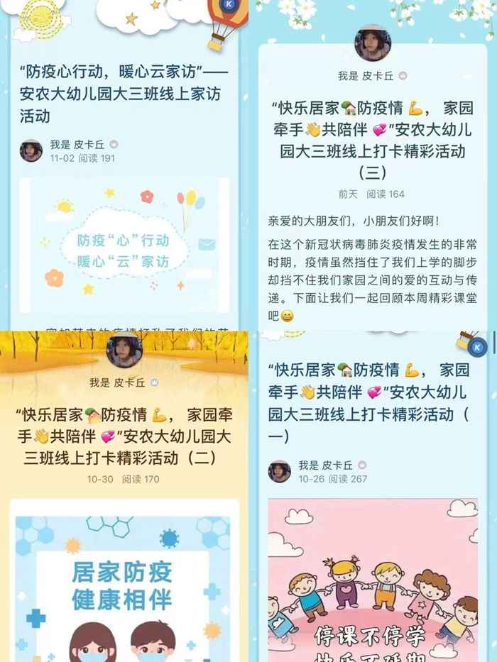 在特殊的日子里,老师们精心准备的线上互动活动有106个,绘画、手工、科学小实验、运动小游戏...让小朋友们宅在家里,生活却同样精彩。看到大家的反馈和互动,老师们也十分高兴,每个班级都利用“美篇”展示了大家的活动,这37篇美篇,篇篇精彩纷呈!