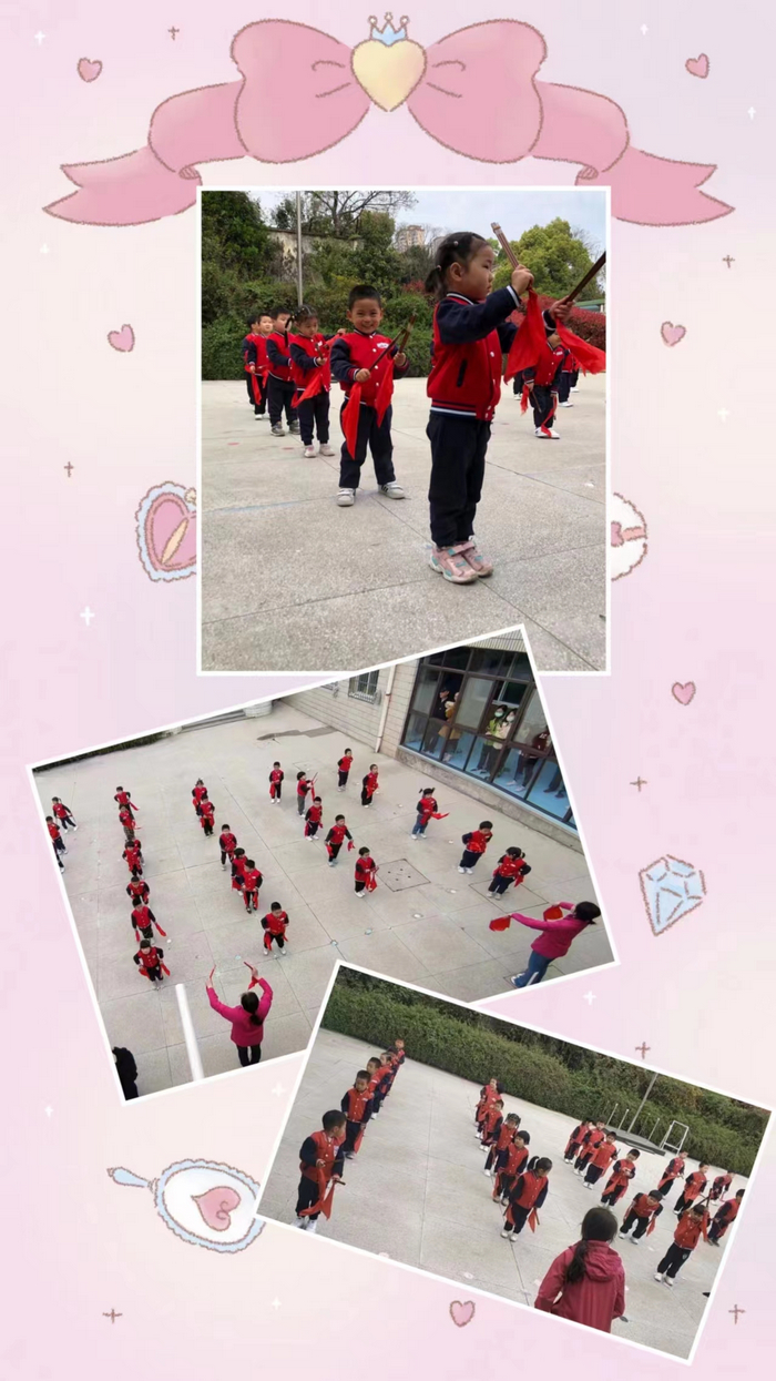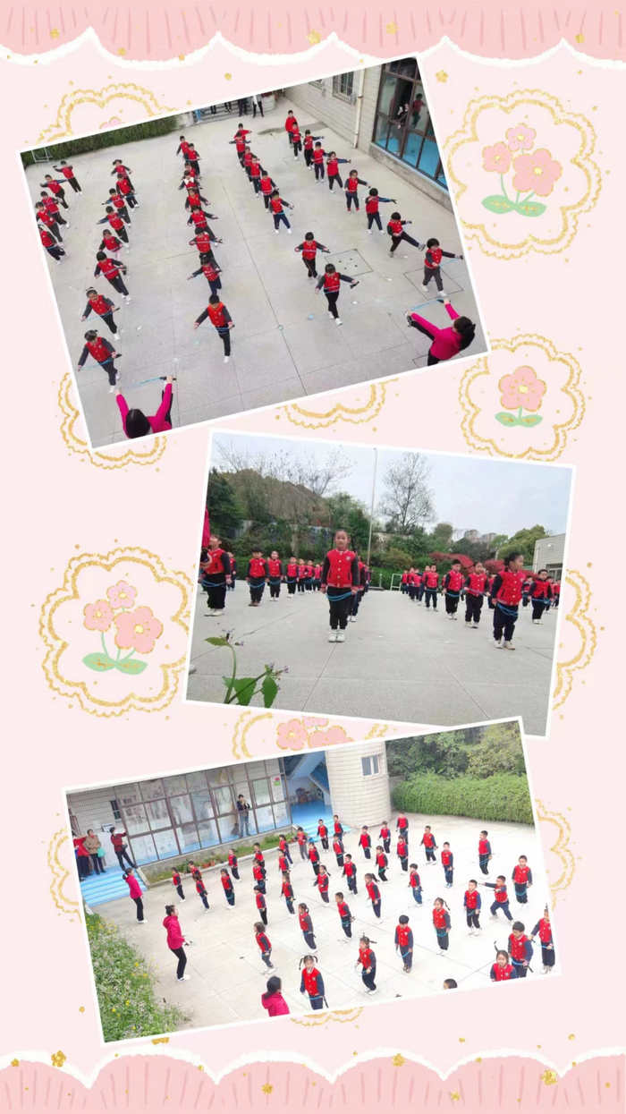 大班早操以跳绳为器械,通过单人跳绳、集体跳绳、花样跳绳、器械操、跳绳游戏发展幼儿身体协调性、增强体能,同时也发展幼儿协作能力、交往能力,为孩子们即将步入小学生活做好身心准备。