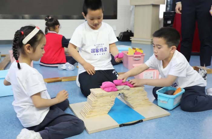 随着裁判员一声令下,安农大幼儿园的小选手们全神贯注地投入到比赛中,他们在河的两侧分别建立桥墩,通过交错搭建的方式在两个桥墩上搭建桥面。桥搭得越高越小心,同时,也考验同伴之间的配合与默契。当桥梁搭建完成后,孩子们开始进行第一项比赛“通船”,只见他们通过牵引、推送、遥控等形式,让“船只”从桥下穿过。完成了第一项比赛的小选手们,迅速进入第二项,继续在桥面上堆放沙包,60秒内在在桥面摆放的沙包越多越好,并且在摆放完毕后桥梁需要保持20秒不倒。 经过现场激烈角逐,最终两支队伍都取得了二等奖的好成绩。