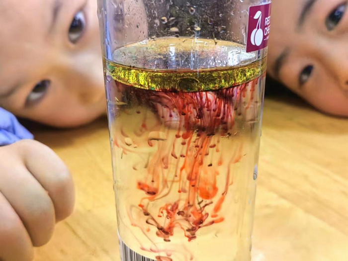 下雨的声音滴答滴答,落下的雨滴是透明无色的。彩虹雨是什么样的?大家准备了很多材料:色素、食用油、透明瓶子、量杯、搅拌棒、清水。在哥哥姐姐的帮助下,小朋友们往量杯中倒入油,再滴入红、黄、蓝色素,用搅拌均匀;然后往透明瓶子中倒入约清水;将混有色素的食用油全部倒入瓶中,静置10秒后瓶中慢慢出现美丽的彩虹雨。