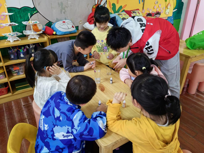 本次活动以科学小实验为主题,大学生哥哥姐姐们先带领孩子们感受生活中美丽景象,再观看视频科学小实验《彩虹雨》。孩子们认真听讲,踊跃的举手发言,积极表达自己的想法。