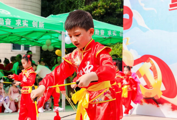 竿动、铃响、心跳,声声入耳;笑脸、朝气、活力,朵朵绽放。中班组小朋友表演的《竹竿飞舞》,人、竿、声、舞,四者有机融合,构筑了一幅生动多彩,充满生命活力的画面。