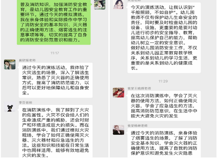 消防演练培训结束后,六位新进教职工均表示受益匪浅,并结合幼儿园消防安全工作,展开了学习心得的交流。