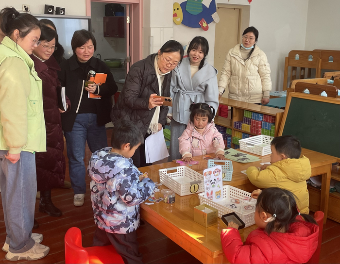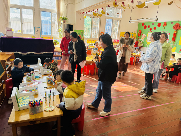 随后,评委来到班级,查看班级现场环境和幼儿游戏情况。