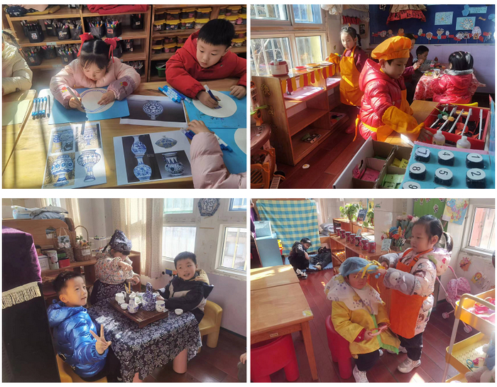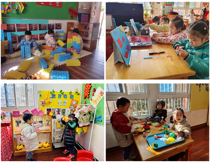 为使幼儿园的每一块墙壁、每一个角落都与幼儿产生交流作用,每班创设了至少5游戏活动区,有效地利用环境促进幼儿的发展,引导幼儿与环境相互作用,区域的选择上便于幼儿活动,材料的提供上利废利旧,便于幼儿取放,让幼儿在一个相对自由的空间里有机会和条件按照自己的意愿和兴趣通过具体的操作、体验去获得经验,发展认知能力,获得驾御材料的能力和探索创造的无限空间