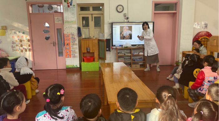 在孩子们好奇的目光中,刘家牧妈妈首先详细地介绍了医生是怎么看病的,了解了医生检查身体的常用工具,还尝试了用听诊器停一停身体里的“声音”,小朋友们认真的样子,像极了真正的小医生。