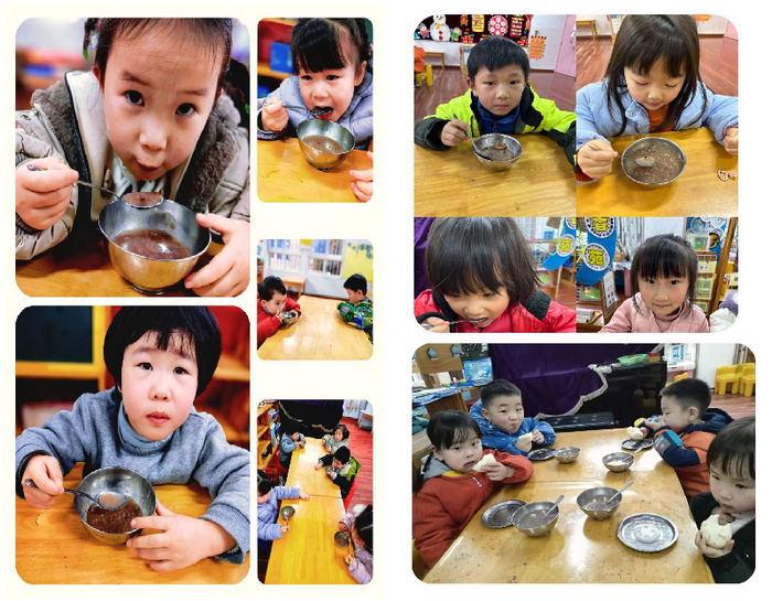 孩子们一边吃着香甜美味的腊八粥,一边寻找着腊八粥里自己所认识的食材。