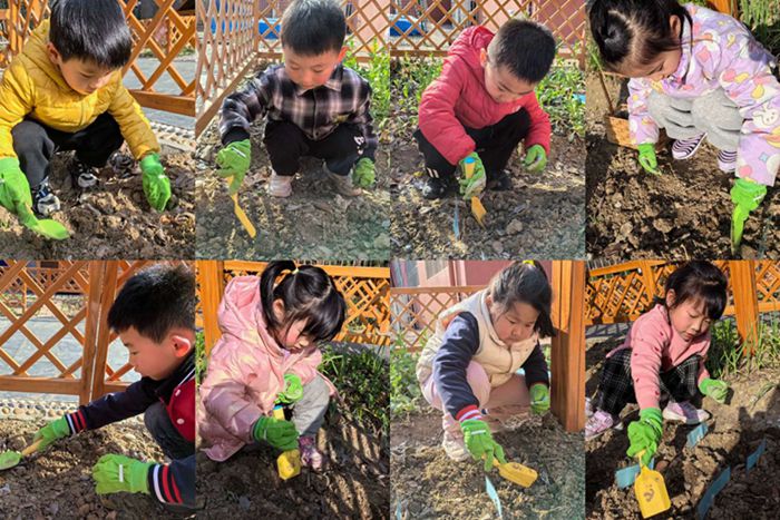 三月的暖春温柔地洒下阳光,温润的泥土中盛满着希望的种子。大三班的孩子们带上小铲子和小水壶,给锄禾园挖土、松土、播种、浇水,忙得热火朝天。