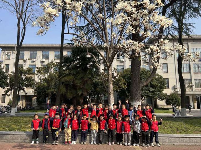 幼儿园里也有很多树木,它们叫什么呢?有什么特点呢?在郝教授的带领解说下,孩子们认识了迎春花、垂柳、合肥市花—广玉兰…