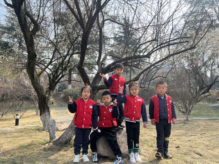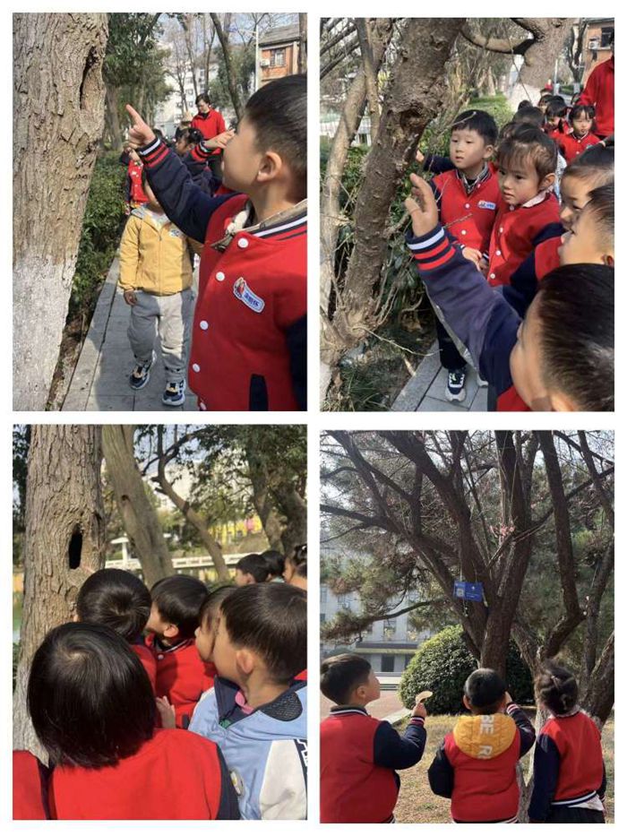 中二班的小朋友来到“梅园”,摸一摸大树,和大树合个影,感受植物的生长变化