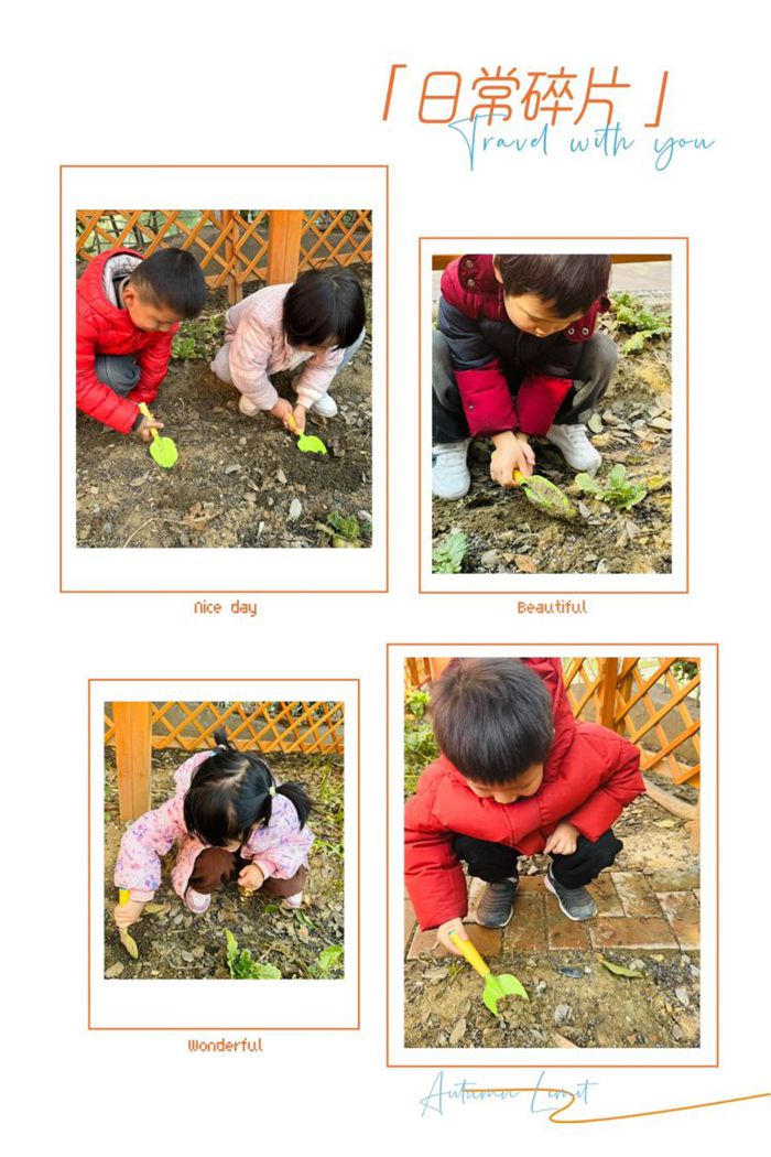 中三班的小朋友去小菜地拔草、松土,去挖土种植大蒜……