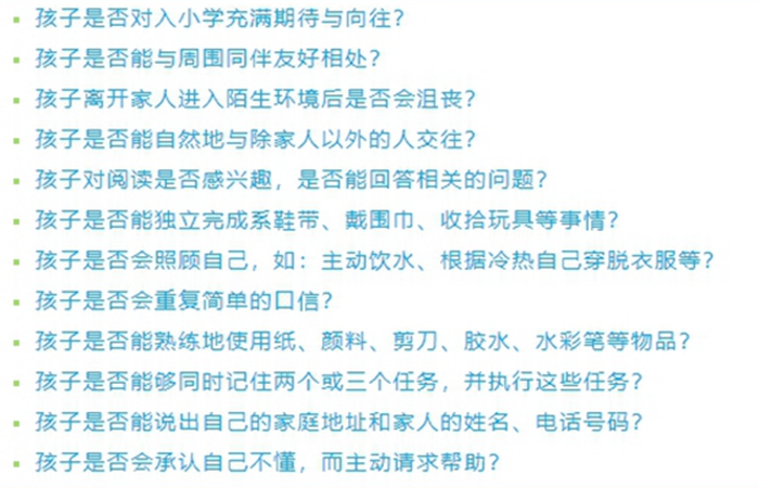 一般而言,孩子对学习是否有兴趣,生活是否有规律,在集体中是否合群,这几个方面情况往往影响其入学后的适应性。您需要时时关注孩子在这些方面的发展,让其逐渐形成良好的学习兴趣、行为习惯等。