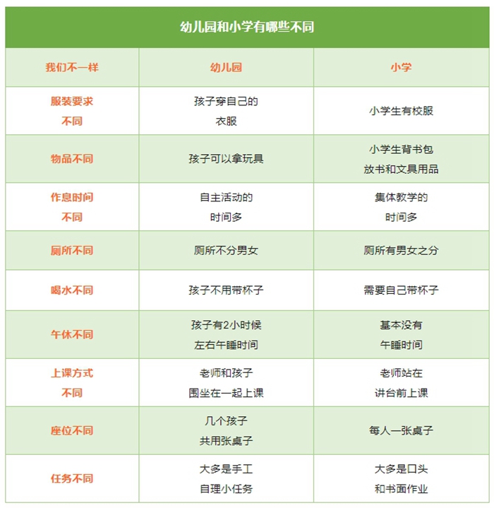 家长们最想知道的,想必就是幼儿园与小学在学习及生活上有什么不同吧,先让我们一起来看看幼儿园和小学都有什么不同:
