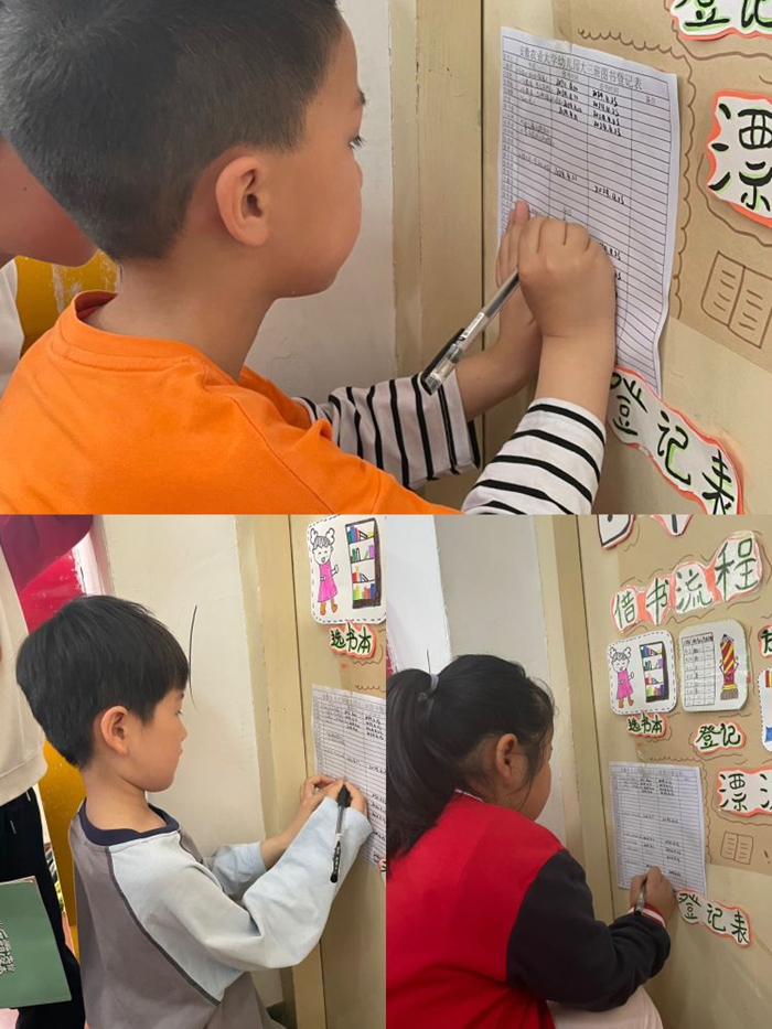 第二步,小朋友们在老师的帮助下,将借阅的书、借阅的时间记录在“图书借阅登记表”上。
