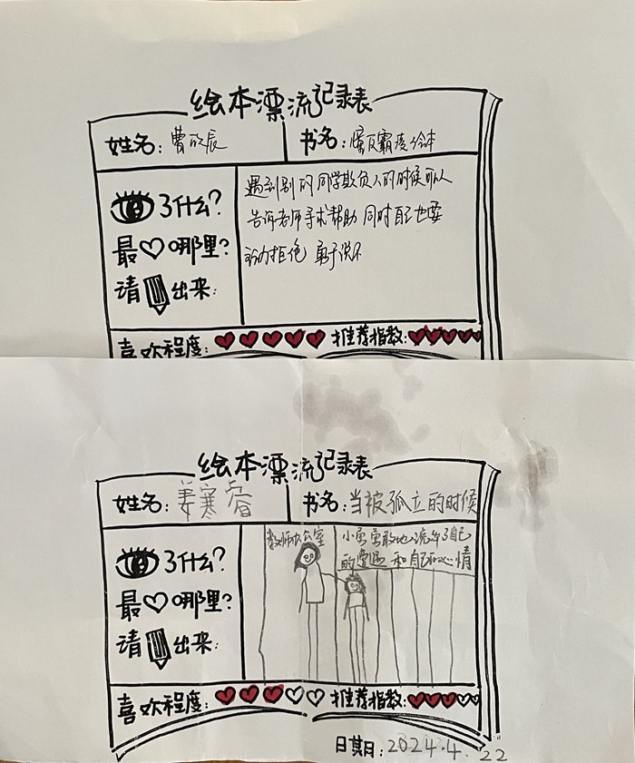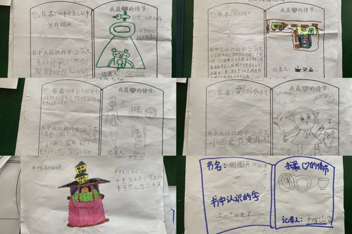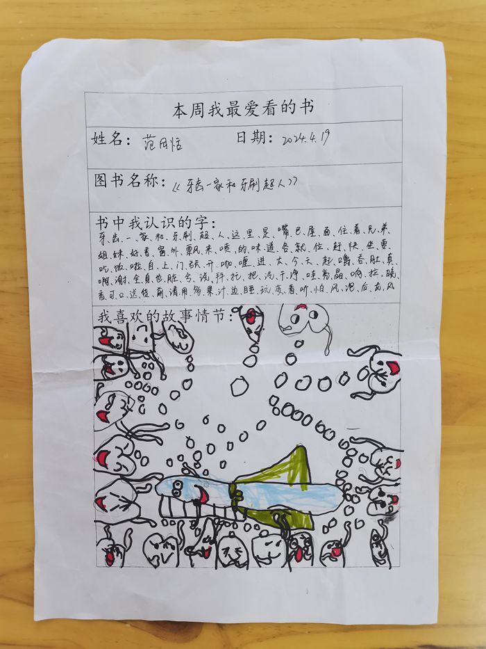 孩子们选择自己喜欢的图书与家长一起阅读,并将阅读内容记录在阅读本上,展现出对书籍的热爱与理解。
