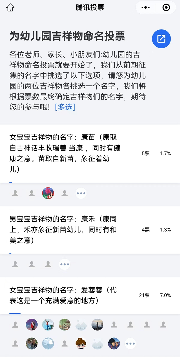 经过园部的评审,最终有12组名字入围,我们开启了投票环节,有137人参与到了“为幼儿园吉祥物命名投票”的活动中来。