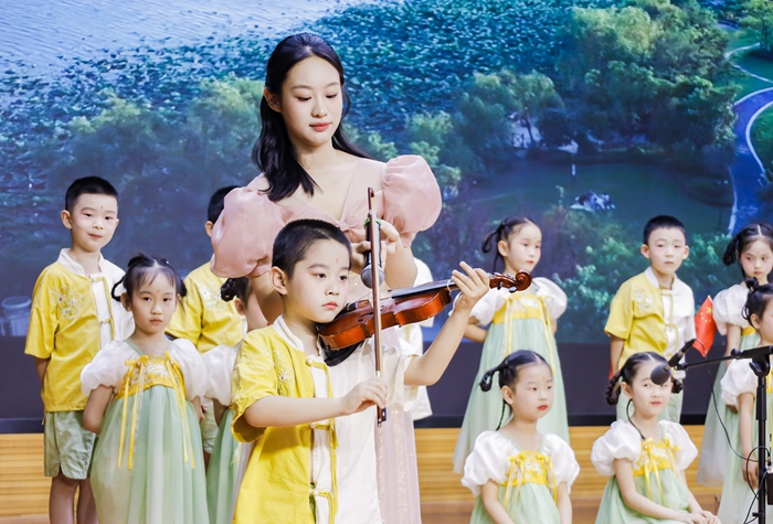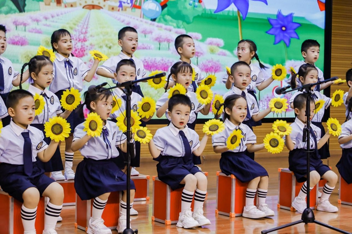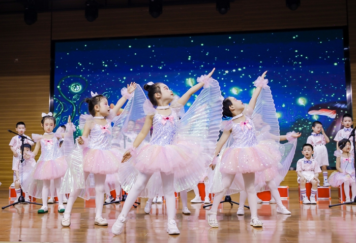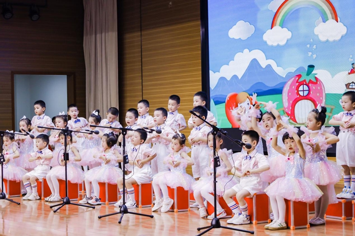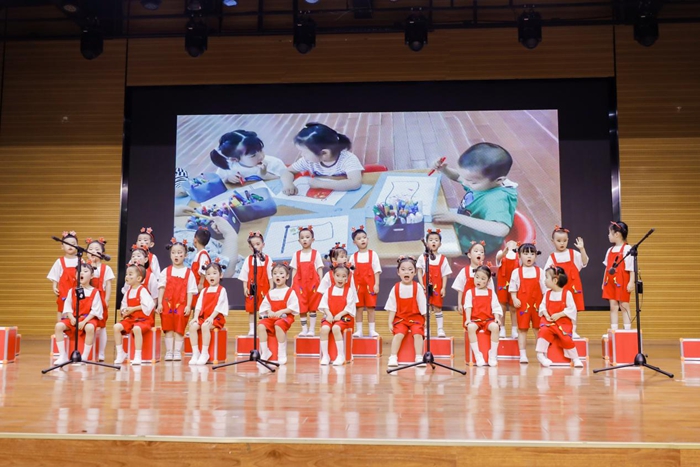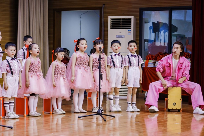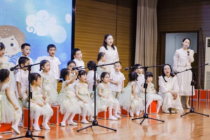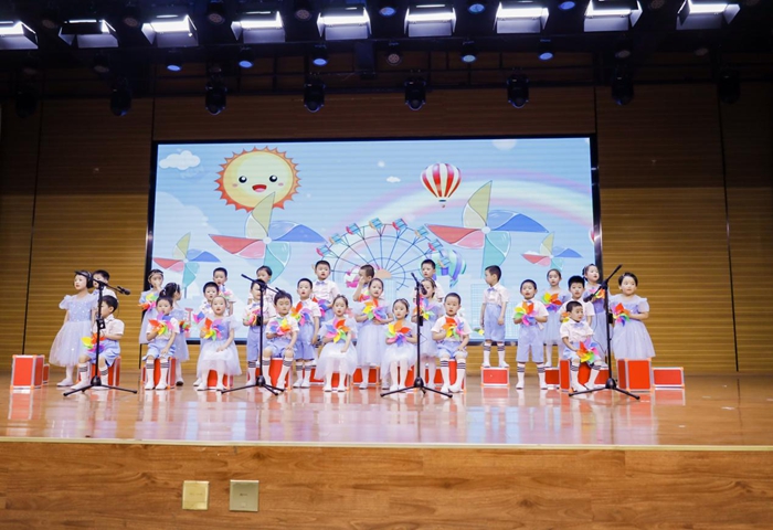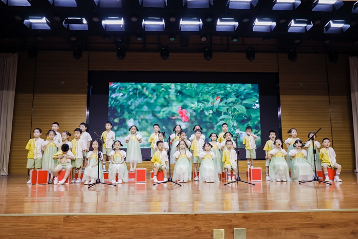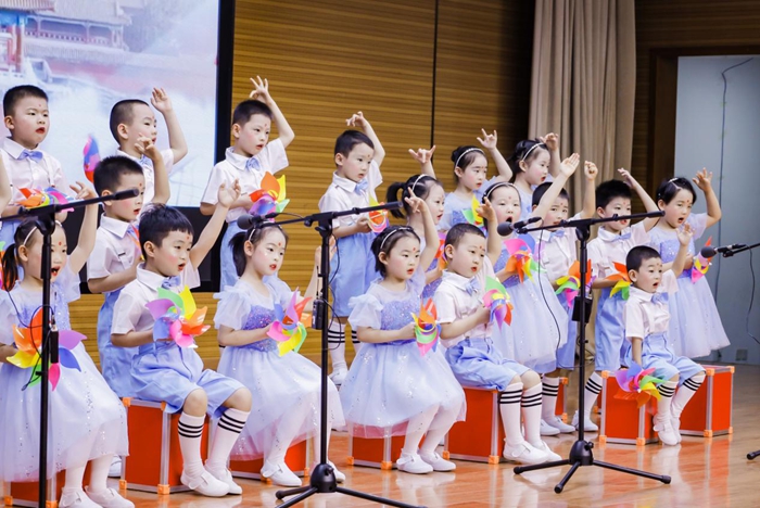 大二班带来歌曲《小池》和《我爱你中国》。“泉眼无声惜细流,树阴照水爱晴柔。”稚嫩的童声对夏日小池浅浅吟唱。“我爱你中国,亲爱的母亲,我为你流泪,也为你自豪!”小小少年随着旋律,在起伏中不断翻滚着对祖国母亲的爱。