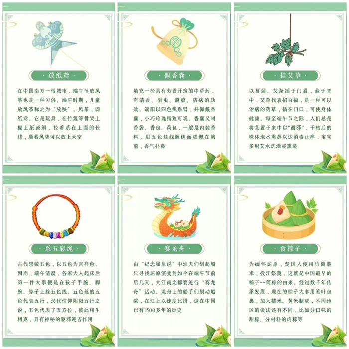 端午节有许多习俗和传统,人们吃粽子、赛龙舟、佩戴香包……这些习俗随着时间和地区的不同会有所变化,但它们都体现了纪念先贤、祈求健康的精神。各班级老师通过视频、图片等方式向幼儿讲述端午节的来历及各地习俗。