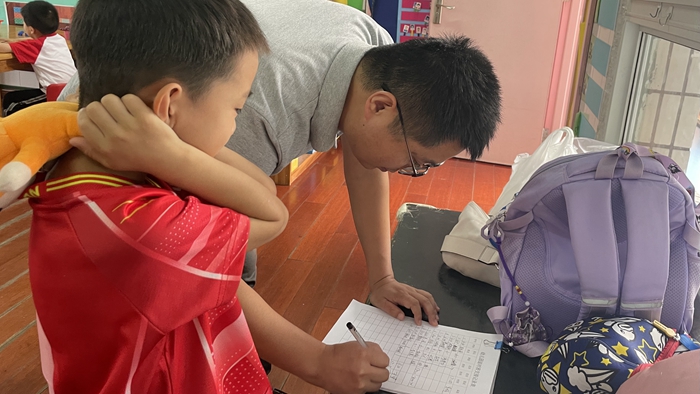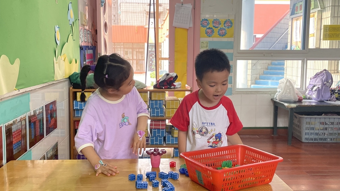 混龄活动,共见成长  由于延时班是“混龄形式”,基于此,班级实行了大带小模式,中大班的幼儿带小班幼儿学习与游戏。在这一过程中,年龄大的孩子乐于“即知即传”,培养了幼儿在不同年龄群体中与他人良性互动的能力,幼儿的自信心、独立性、责任心和情感等从中得到发展。