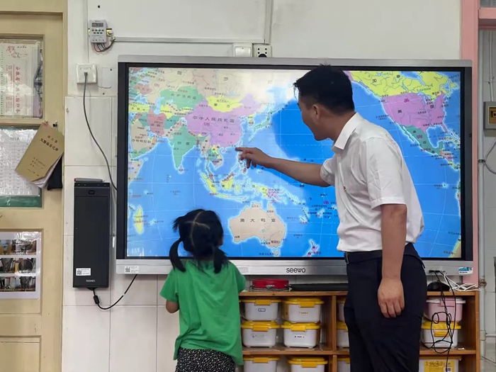 接着,张艾平爸爸还介绍了五星红旗。红色的旗面象征着革命,最大的五角星象征着中国共产党,四颗小星象征着在中国共产党的领导下革命人民大团结。并且认识了世界地图,小朋友们非常的感兴趣,都想上来认一认。