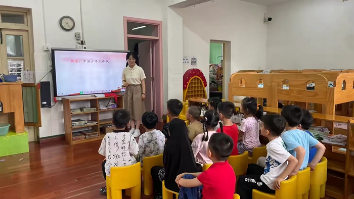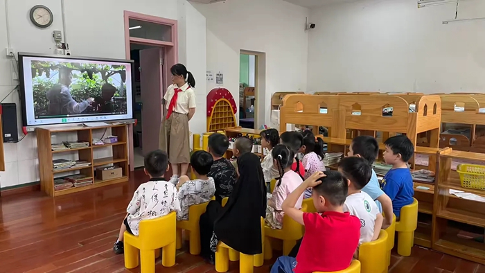 在王毓君妈妈的介绍下,小朋友们一起了解了少先队的有趣活动,春耕、秋收、敬老……活动丰富多彩,小朋友们看的可聚精会神了!