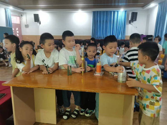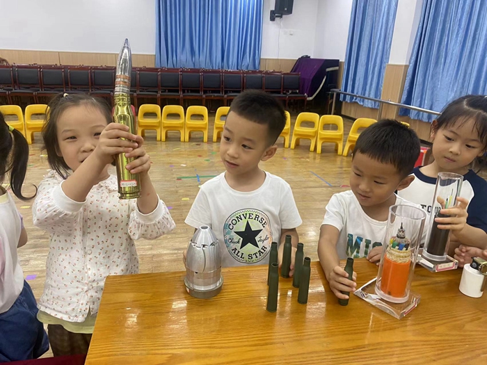 随后,宋老师一一介绍桌面上的模型,有催泪弹、集成电板,蒸汽机,坦克、导弹等等,并请幼儿上前细细观看。